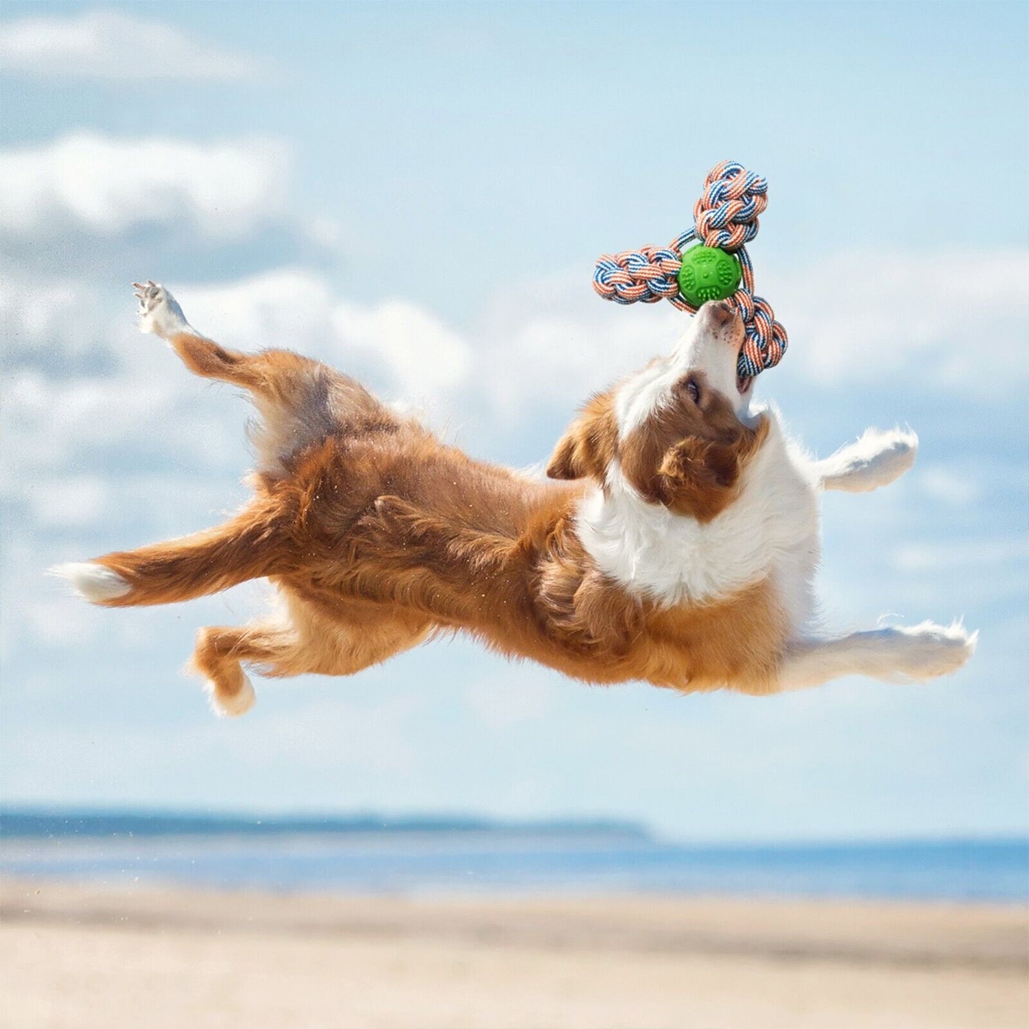 The Tuggies Tri-Pull Rope Toy is the best rope toy to provide your dog with hours of fun. The toy's design is great for playtime and tugging for your dog and is durable enough to withstand the most aggressive chewers. It also comes with a treat dispenser/teething ball to keep your dog's hygiene healthy and award them with treats during playtime. With a rope toy as unique as ours, it will be your dog's new favorite toy!