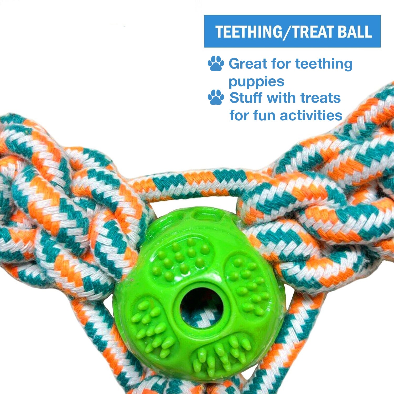 - TEETHING BALL: Keep your pup engaged, mentally stimulated, and hygeine healthy with the built-in treat dispenser ball. Load it up with your dog's favorite snacks for rewarding playtime. The center ball also works great as a teething aid to keep your dog's hygiene in check with the soft rubber teeth surrounding it